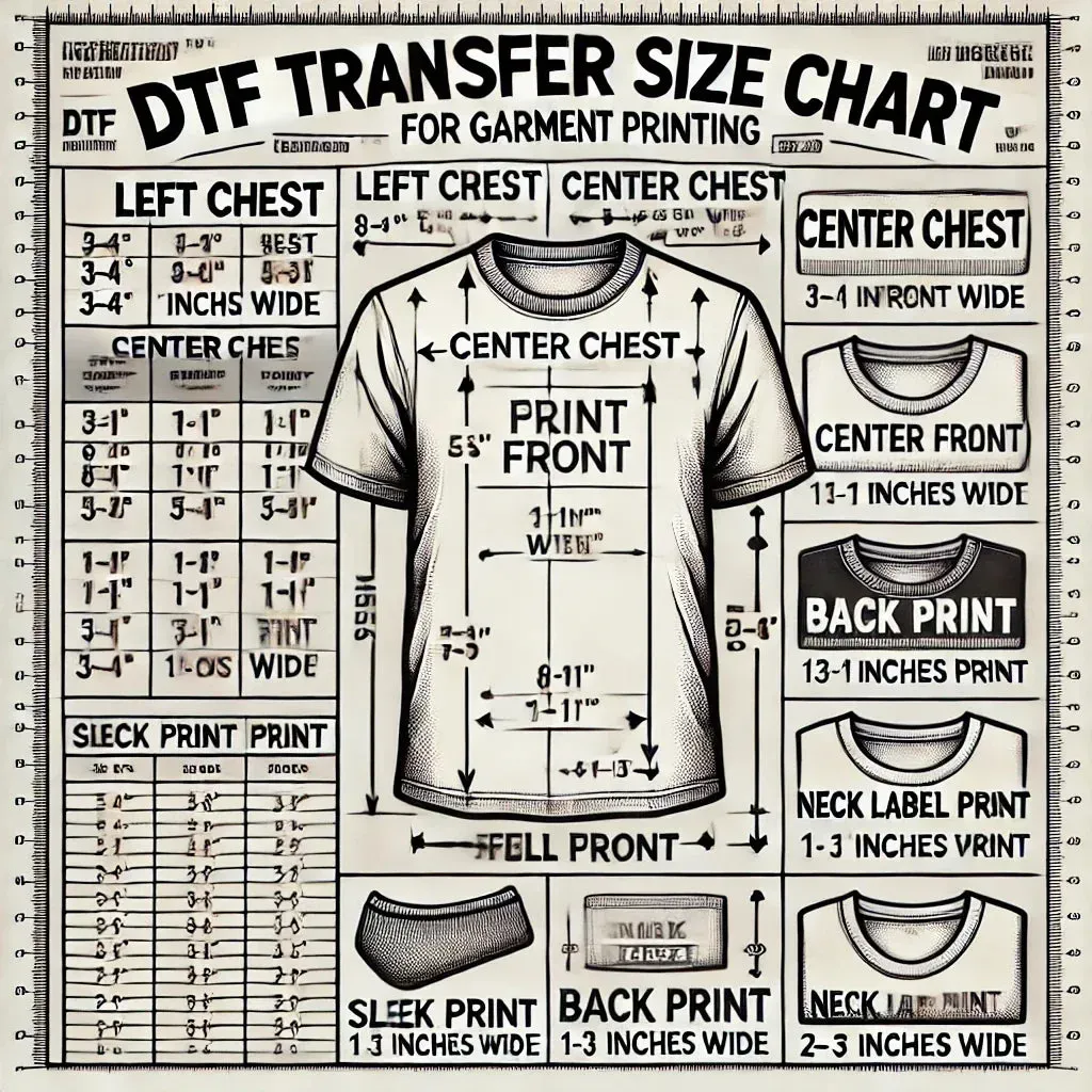 | What is a DTF Transfer Size Chart | A template that defines printable zones for front, back, and sleeves and translates inches or centimeters into garment measurements to guide artwork placement. |